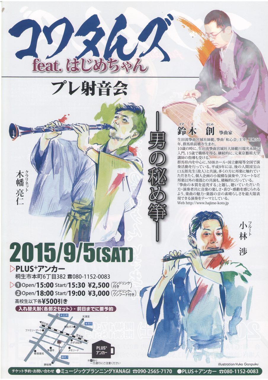 フルートの小林渉さんと、クラリネットの木幡亮二さんのユニット、「コワタンズ」と私の共演となります。普段はあまり演奏することのない、洋楽や懐メロ・クラッシック音楽などを中心に、フルート・クラリネット・箏の音色をお届けします。
