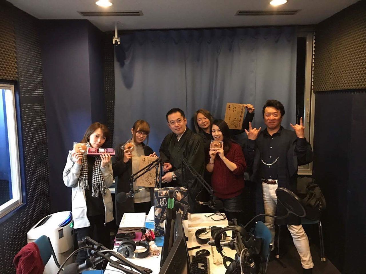 パーソナリティーの方が4名、DJの方が1名と、大人数の編成なのですが、パーソナリティのうち2名は遅れて合流。番組中にお菓子が出て来たりと、生放送のゆるーい番組でした。