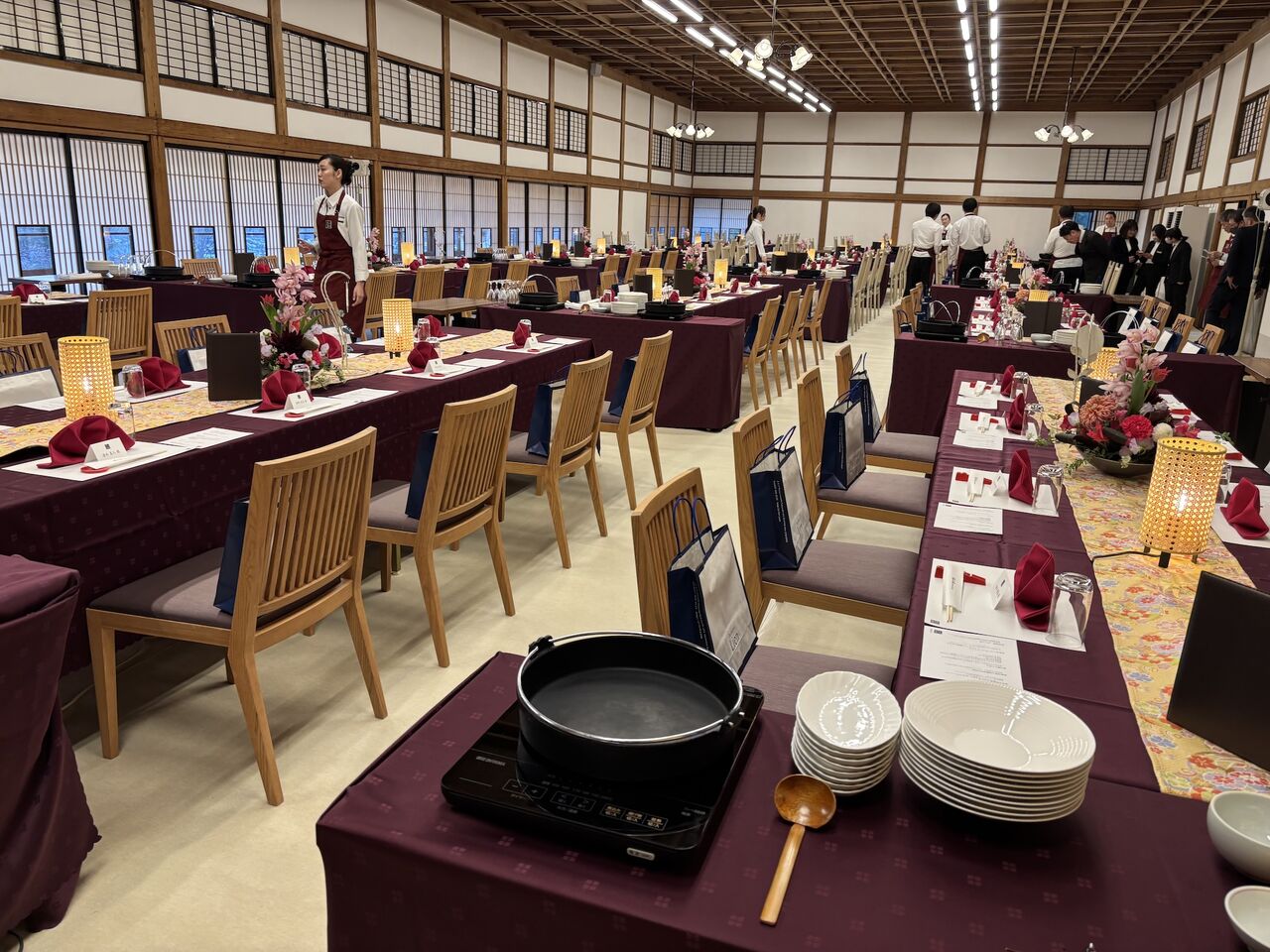 臨江閣の2階は大広間になっているのですが、昨晩はそこに120名のお客様が入り、すき焼きを堪能。なので、演奏と踊りのスペースはミニマムかつセッティング時には沢山のスタッフの方がパーティーの準備をしていて、楽器を入れた写真を撮る余裕がありませんでした。その代わり、最後に会場の写真を掲載しておきます。