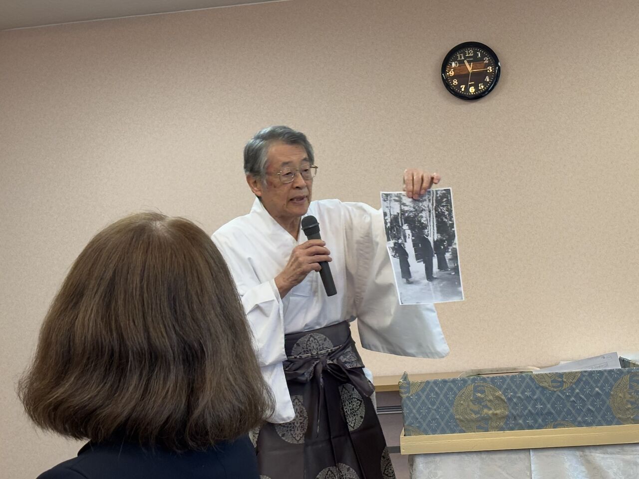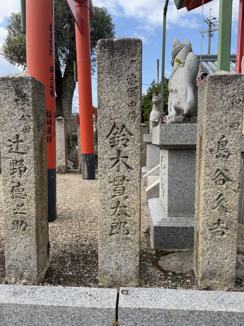 次の訪問先は、多治速比売神社で、鈴木貫太郎生誕の地の近くにあり、子供の頃に日常的に立ち寄っていたのではないかという場所です。実際に大正12年に寄進された玉垣や、二・二六事件で瀕死の重傷を負った後に回復し、その後参拝した写真も残っています。その写真に写っている宮司さんのお孫さんが、現在の宮司さんでした。