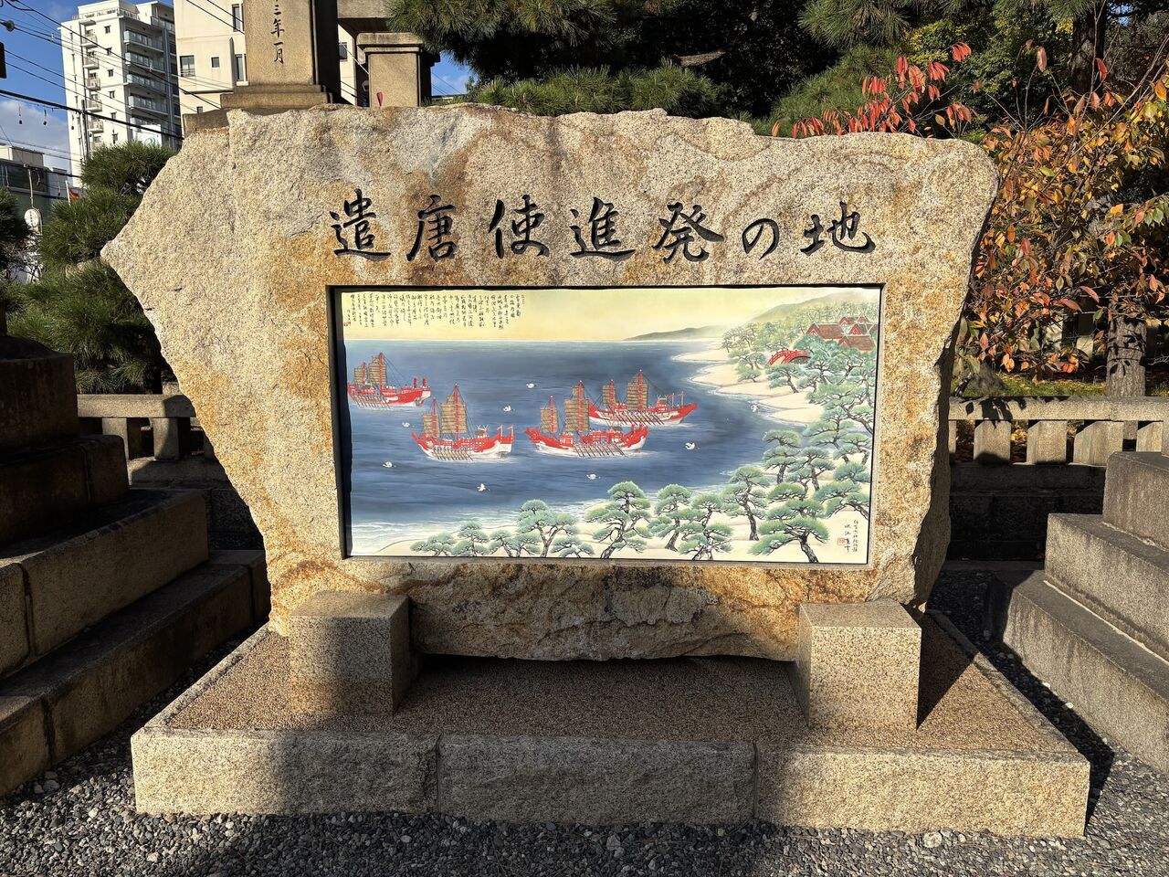 最初の訪問先は「住吉大社」。ここは、鈴木貫太郎が参拝したと言われております。でもそれ以上に、すでに1500年以上の歴史を持ち、遣唐使の進発地点になっていたということで、記念碑がありました。また、4つの社のうち3つは直線に並んでいて、それが西を向いています。これは、海に向けて建てられていて、何かの当時の国家メッセージを感じるものがあります。