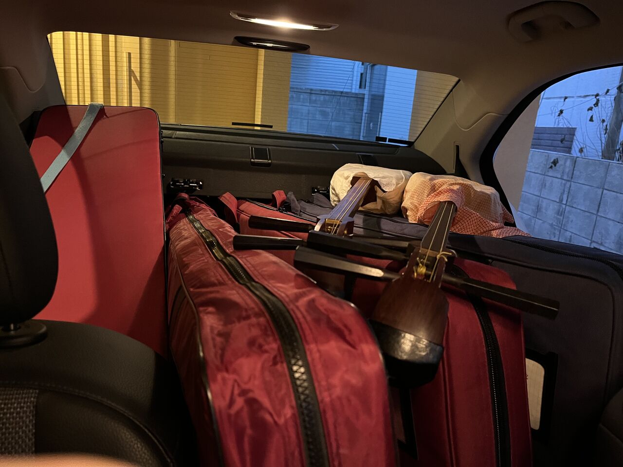 助手席を前に出し、トランクスルーにすると、お箏を縦に入れることができます。