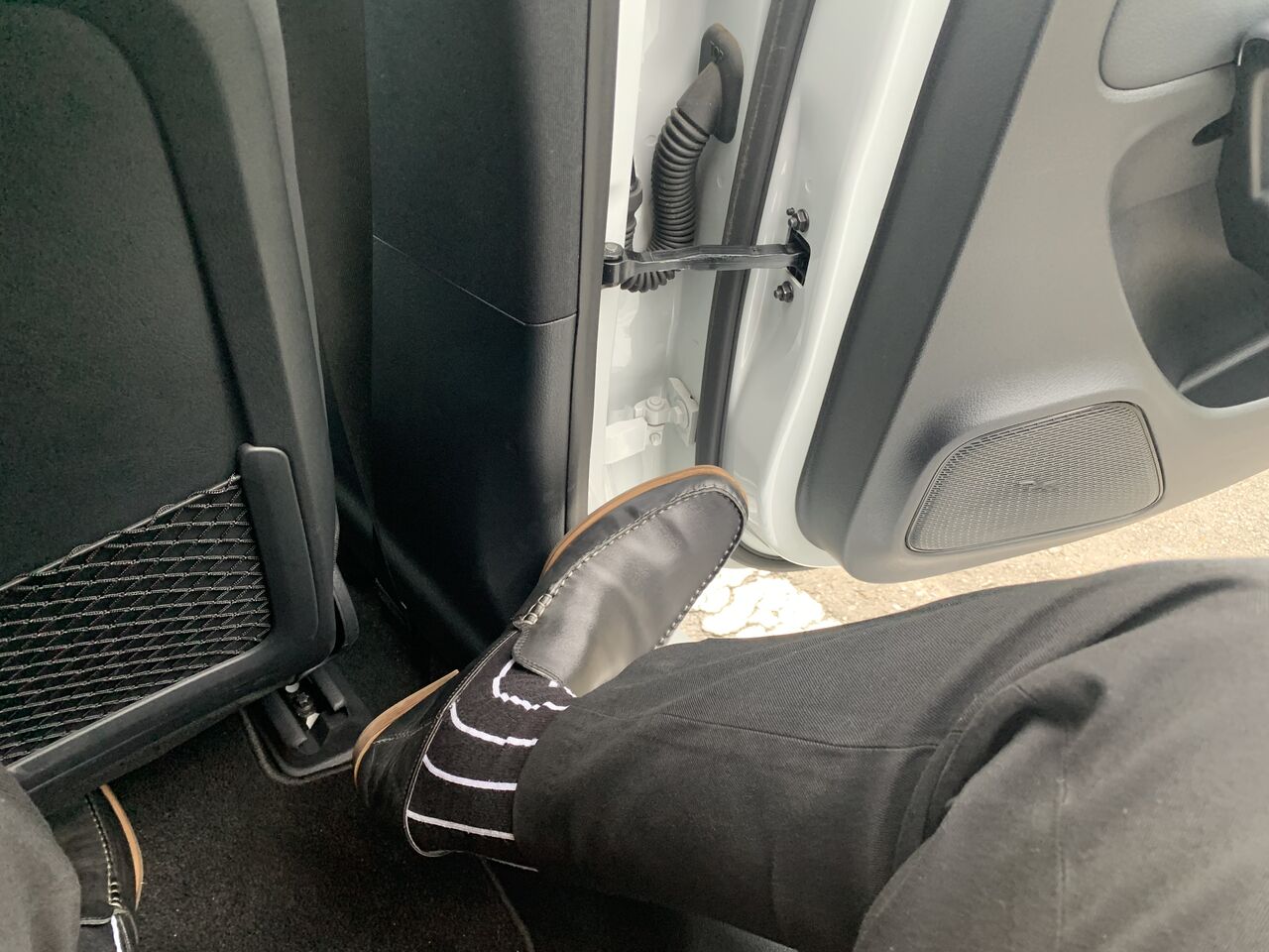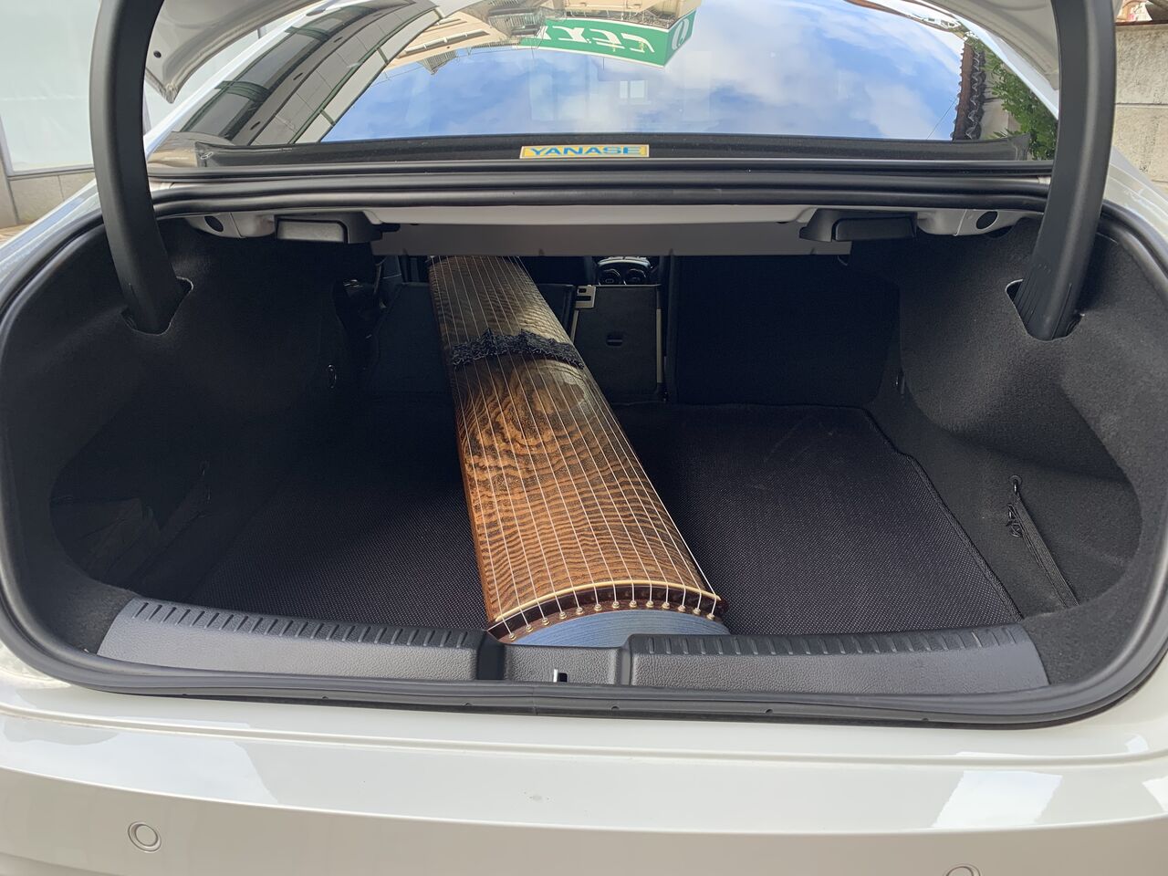 代車に十七絃を乗せてみました。やはり、助手席を一番前まで出さないと乗れません。これじゃあ、助手席に人が乗れないなあ。