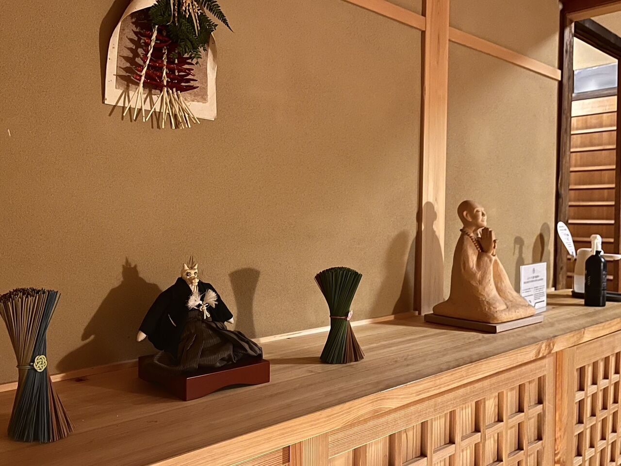 到着時にはもう日が暮れていたいので、境内の様子はわかりませんでしたが、宿坊内は簡潔でシンプルだけど、和とモダンと品の良さを感じる設になっています。また、とても美しい中庭や、伝統を感じる和風建築を眺めることができ、個人的にはとっても好みに合う空間。17時を過ぎると無人対応ができる様になっています。